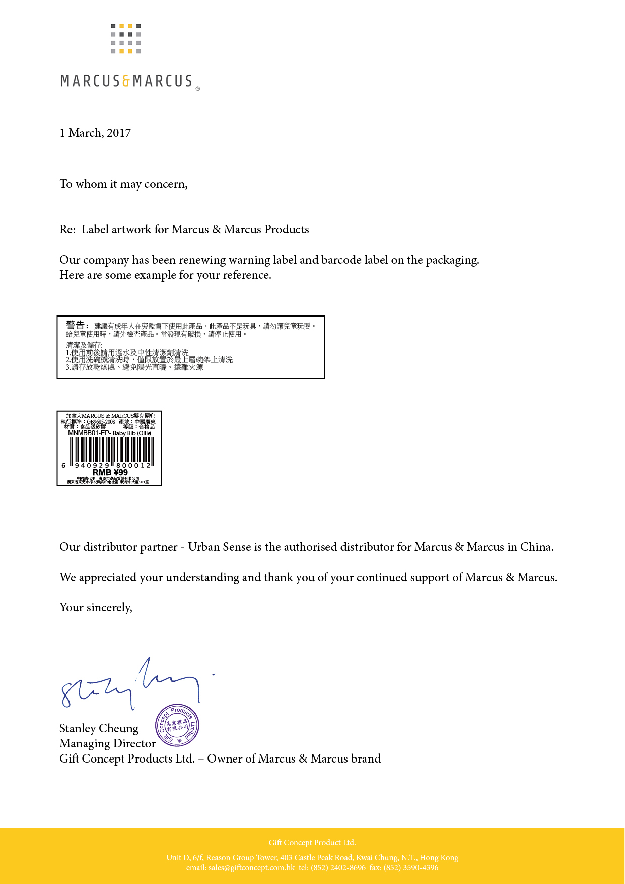MARCUS&MARCUS更换警告贴和条码贴更改声明(中文标签)